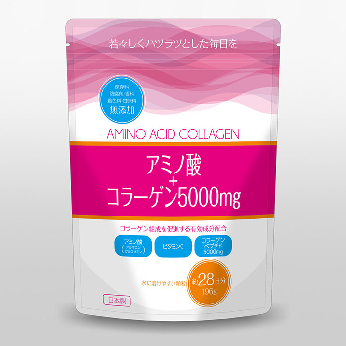 コラーゲン組成を促進する有効成分、アミノ酸(アルギニン、グルコサミン)、ビタミンC、コラーゲンペプチド5000mgを配合。コラーゲンは摂取しても体内ではアミノ酸に分解されるため、コラーゲンを組成するアミノ酸を積極的に摂取することで、コラーゲンの再組成を促進することが可能です。コラーゲンは、30代をピークに加齢とともに組成能力が低下、減少。サプリメントなどで補うことが、お肌の健康維持には有効。コラーゲンペプチドは、吸収されやすい小さな分子のコラーゲンで、水溶性で摂取しやすいのも特長です。コラーゲンペプチドも体内のコラーゲン組成を促進すると言われています。保存料・防腐剤・香料・着色料・甘味料など無添加で安心してお使いください。